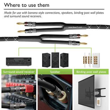 - Quick and easy installation for connecting a speaker to an A/V receiver or amplifier with banana plug style ports; Precision bolted interior banana plug terminations create a secure connection and a convenient alternative to cutting and terminating speaker wire with banana plugs *Package includes 1 cable*
