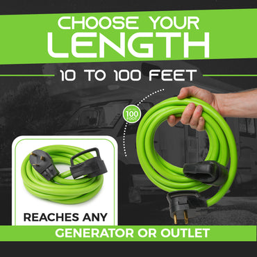 Each end of this 30 amp power cord features a 3 prong plug with the NEMA TT-30 specification, compatible with standard plugs on many generators