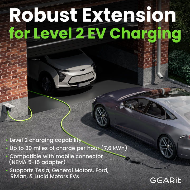 This 50-amp power cord comes with a 4-prong plug built to NEMA 14-50 specifications, offering Level 2 EV charging for faster, more efficient vehicle power-ups. It features ergonomic handles for a secure and reliable connection that stays firmly in place but is easy to disconnect when needed.